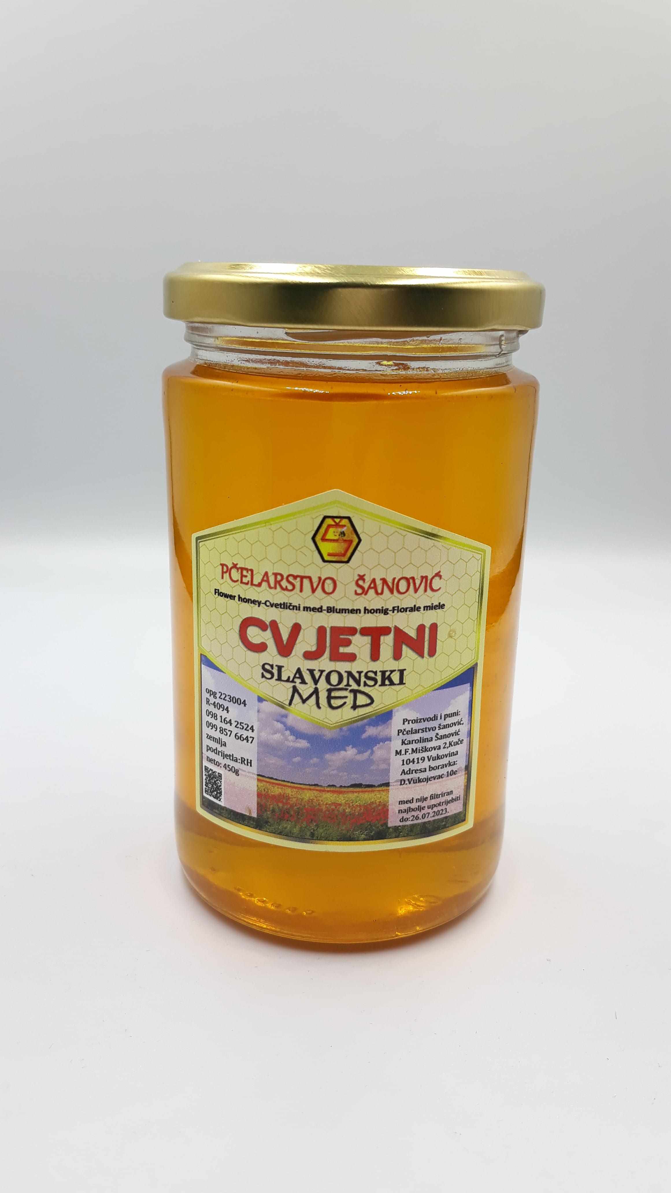 Slavonski cvjetni med je upečatljivo žute boje, nježnog mirisa i pomalo aromatičnijeg okusa.